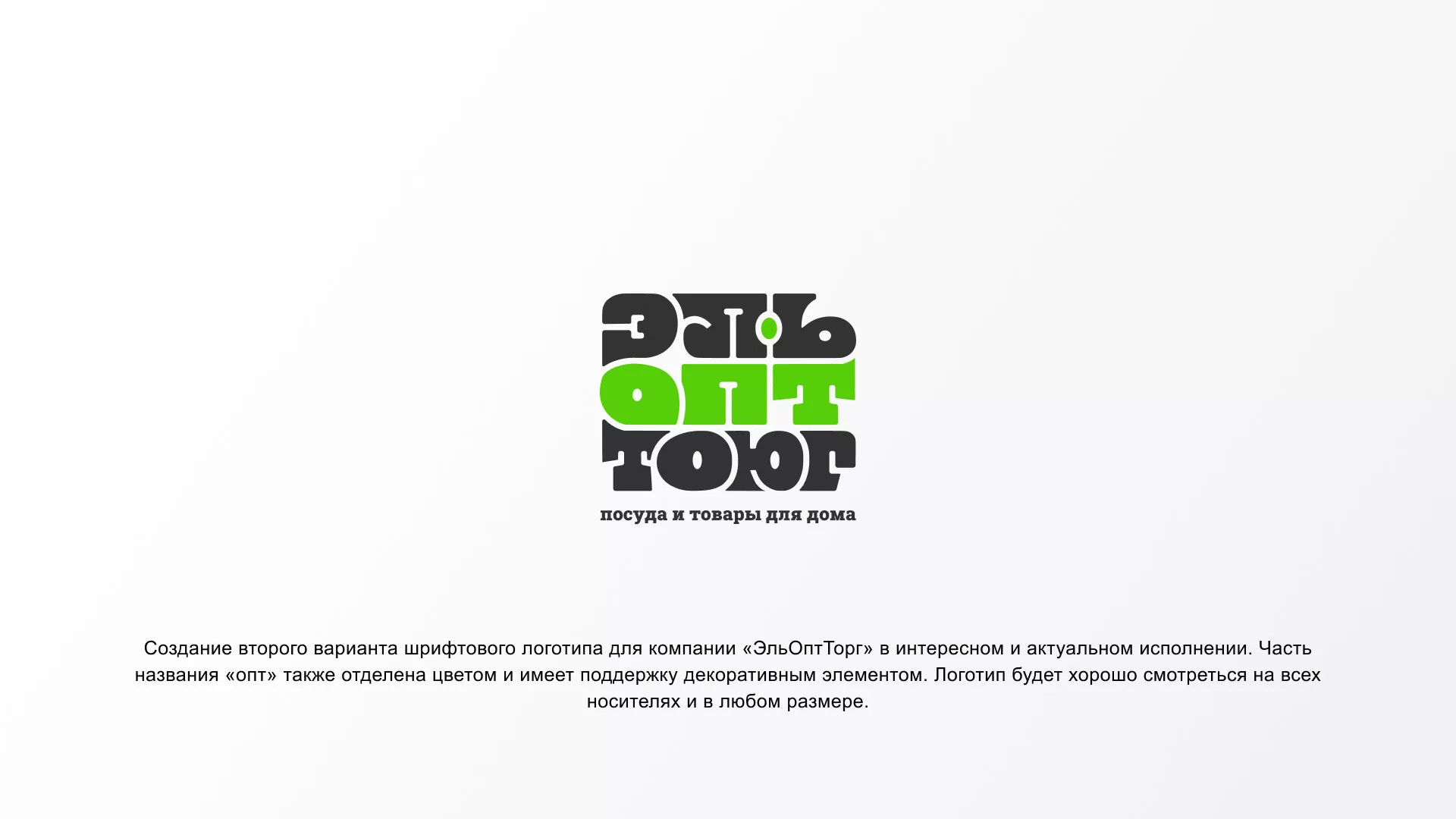 Создание второго варианта шрифтового логотипа в Новом Осколе для компании «ЭльОптТорг» в интересном и актуальном исполнении. Часть названия «опт» также отделена цветом и имеет поддержку декоративным элементом. Логотип будет хорошо смотреться на всех носителях и в любом размере.